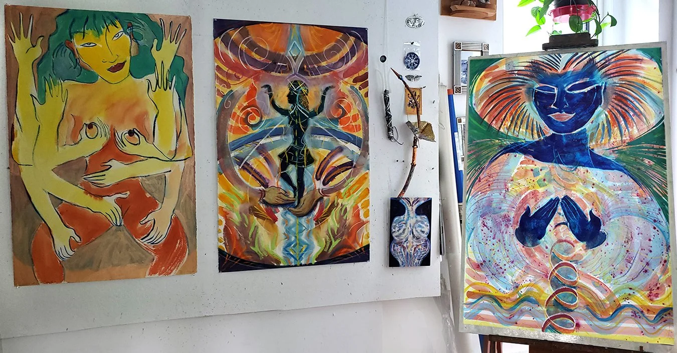 My art practice has always been a kinesthetic one - grounded in the body and its senses and energies - whether painting humans, deities or portraits of the earth. Coming from dance, movement, ecstatic poetry and music, my work flows onto the paper, often with both hands, using all the body’s knowledge to reveal the underlying sources of energy. Characters from many races, sexes, sizes and forms appear on my easel, seemingly from deep memory. Sometimes they are dreamed up by brushes and paint.